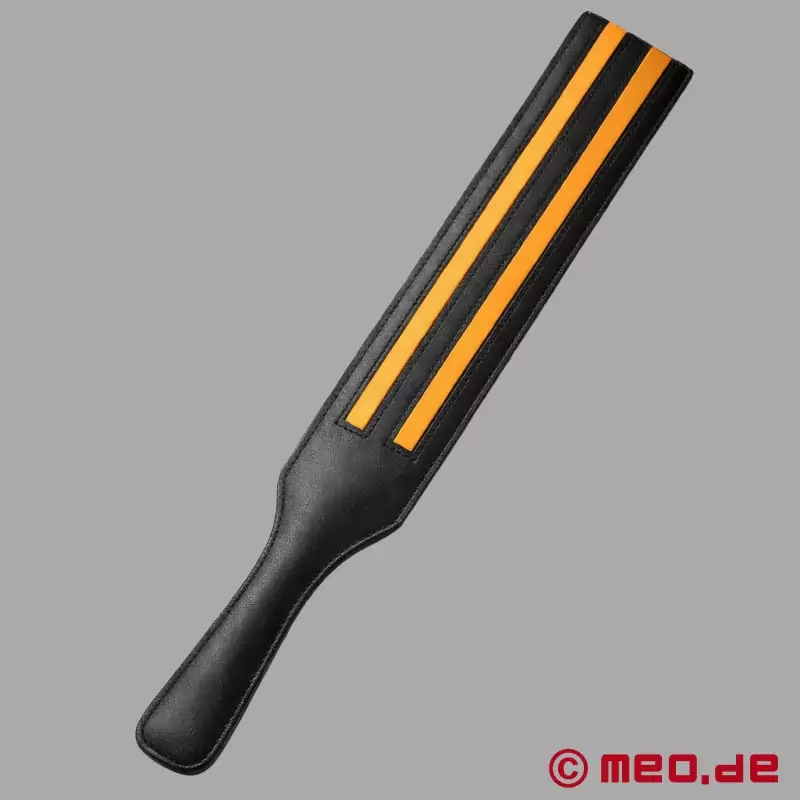 S celkovou délkou cca 52 cm a šířkou 8 cm kožené pádlo v závislosti na intenzitě úderu buď zapraská, nebo pleskne po zadku. Žluté pruhy všité do černé kůže zdobí kožené pádlo a vytvářejí příjemný kontrast.