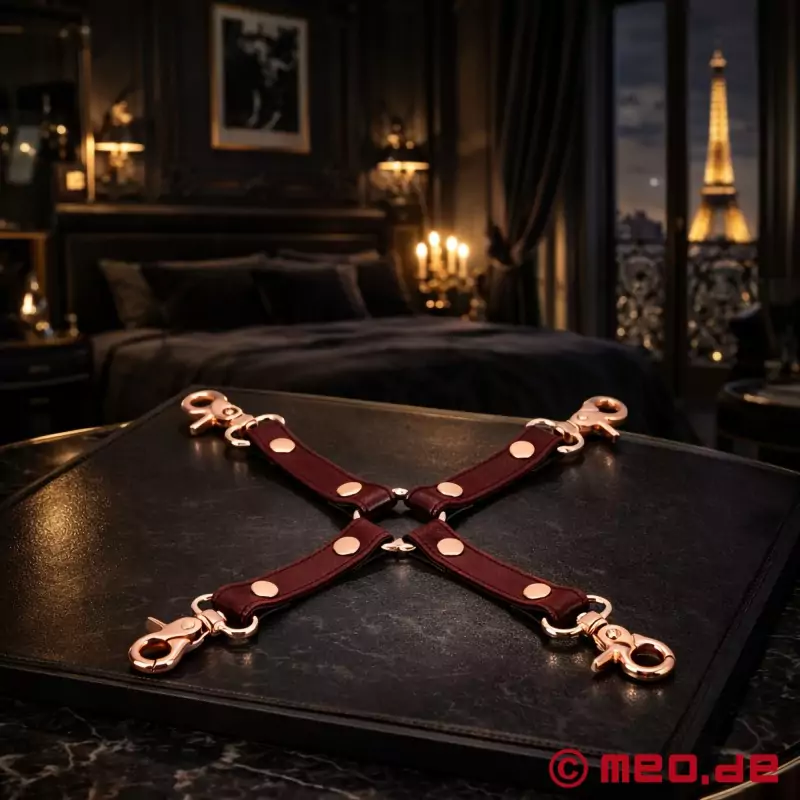 Pouto - tzv. Hogtie - z kolekce Noblesse je nepostradatelným doplňkem pro bondage. Vyroben je z japonské hovězí kůže a lze s ním snadno a rychle vytvořit různá pouta. Pevné popruhy křížového spoutání jsou důmyslně zpracované a pevně přinýtované, takže snadno odolají i silnému škubnutí ze strany neposlušných Subů.