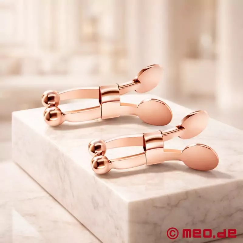 Kvintesence zážitku rozkoše a bolesti s BDSM svorkami Dr. Sado z růžového zlata spočívá v jedinečné kombinaci intenzivní stimulace a tenké hranice mezi rozkoší a bolestí. Tyto nádherné svorky, které byly speciálně vyvinuty pro citlivé oblasti bradavek a genitálií, působí na nejhlubší úrovně smyslného prožitku. Díky svému speciálnímu tvaru a intenzivnímu tlaku svorek nabízejí extrémní zážitek pro všechny, kteří chtějí nejen zkoumat, ale také si plně vychutnat hru s hranicí slasti a bolesti. Jsou vyrobeny z elegantní nerezové oceli v barvě růžového zlata, spojují estetiku s funkčností a jsou jasnou výpovědí pro znalce, kteří hledají vzrušení. Tyto svorky nejsou vhodné pro začátečníky, ale slibují nezapomenutelný zážitek pro každého, kdo je připraven posunout své hranice a zažít plnou intenzitu BDSM.