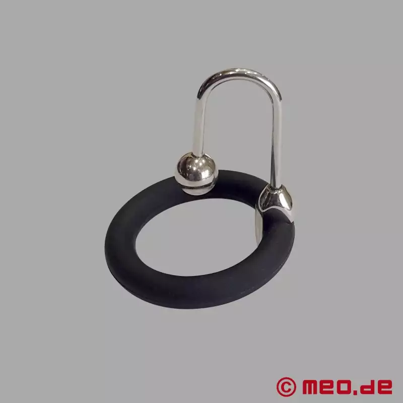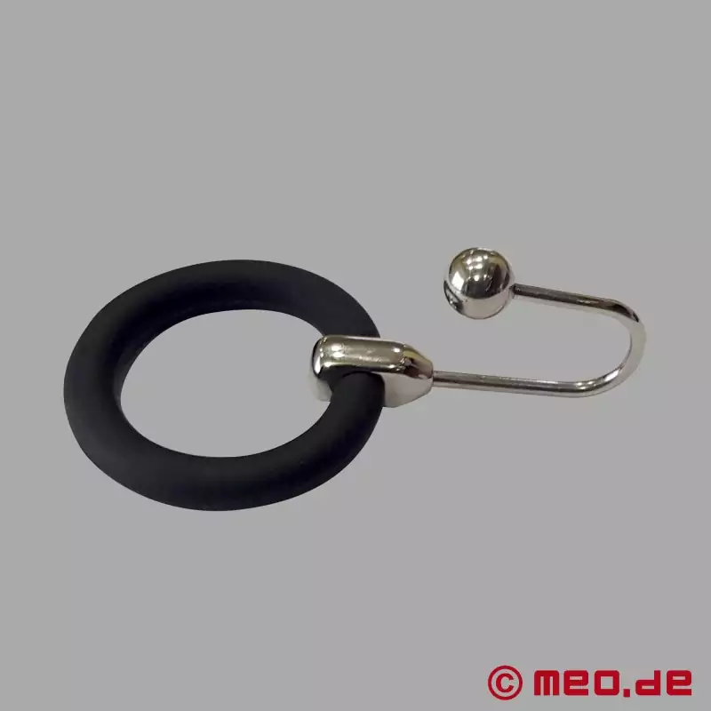 Give yourself and your partner a wild experience while wearing this glans ring with an urethral plug. The ring will attach firmly to the head of his cock and a movable hook frame will hold an 8mm stainless steel ball firmly inside his urethra.