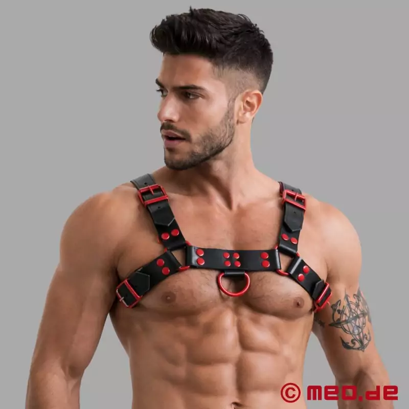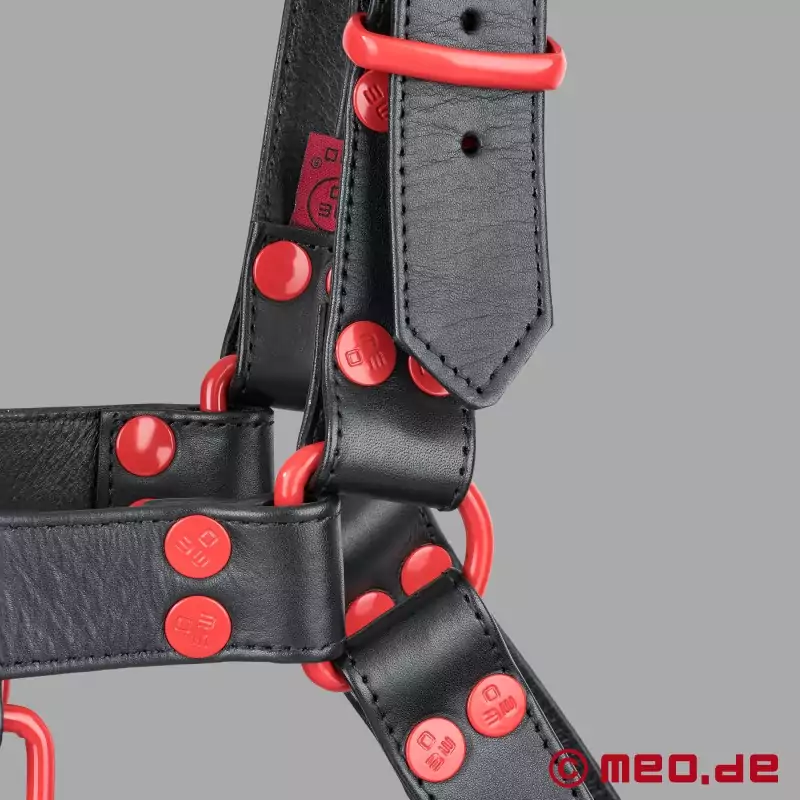 Tento černo-červený kožený postroj od MEO® je první volbou pro každého, kdo chce dát viditelně a sebevědomě najevo své sexuální preference. Postroj FetishGear™ v černo-červeném provedení dává svými červenými detaily jasně najevo svou mužnost, nekompromisnost a je stvořen pro silné výkony.