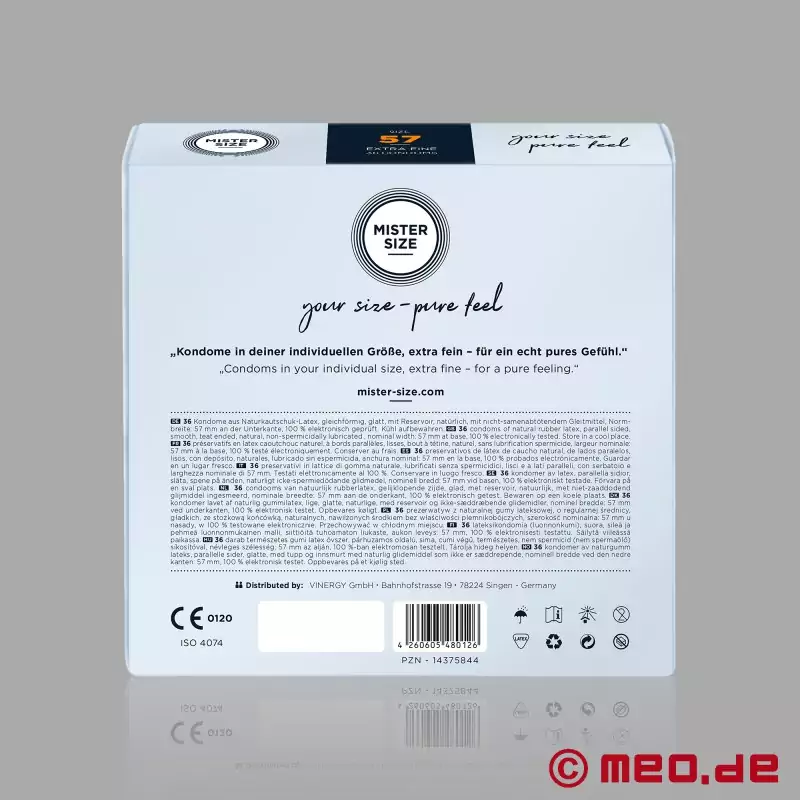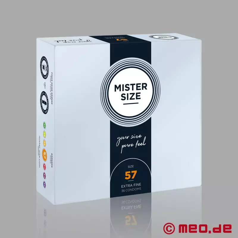 Obvod penisu nebo jmenovitá šířka je nejdůležitějším faktorem při výběru správné velikosti kondomu, protože má významný vliv na bezpečné uchycení a pohodlí při nošení. V závislosti na velikosti se kondomy MISTER SIZE™ liší také délkou a tloušťkou stěny, což znamená, že kondom nejen lépe padne, ale také působí znatelně přirozeněji a snadněji se sroluje až ke dnu.