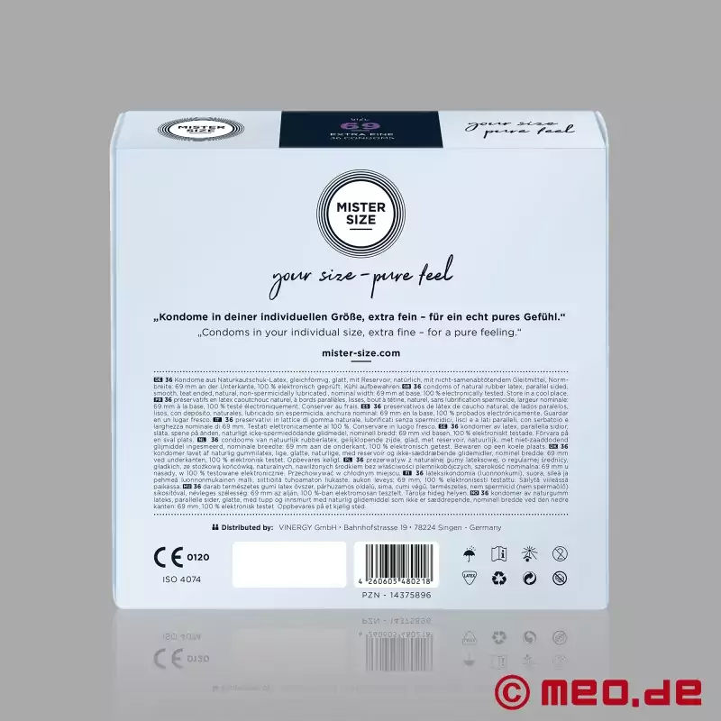 Kondomy MISTER SIZE™ nabízejí pohodlné nošení a zároveň spolehlivou ochranu. Vyhovují normě ISO 4074, jsou dermatologicky testovány a v rámci procesu kontroly kvality jsou 100% elektronicky testovány.