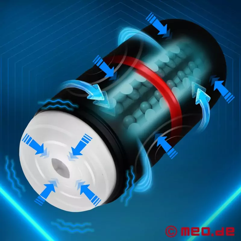 Protože to není jen masturbátor - je to skutečný sexuální stroj pro maximální stimulaci a výbušné orgasmy! Jeho důmyslná vnitřní struktura s protiskluzovými nopky masíruje při každém pohybu celý penis a vytváří realistický pocit, který se mimořádně blíží pocitu orálního nebo análního sexu. Kombinace rotace, přítlačného pohybu a vibrací zvyšuje intenzitu každého doteku - ideální pro intenzivní Cum Control nebo pro kontrolu orgasmu během BDSM, jako je Tease & Denial.