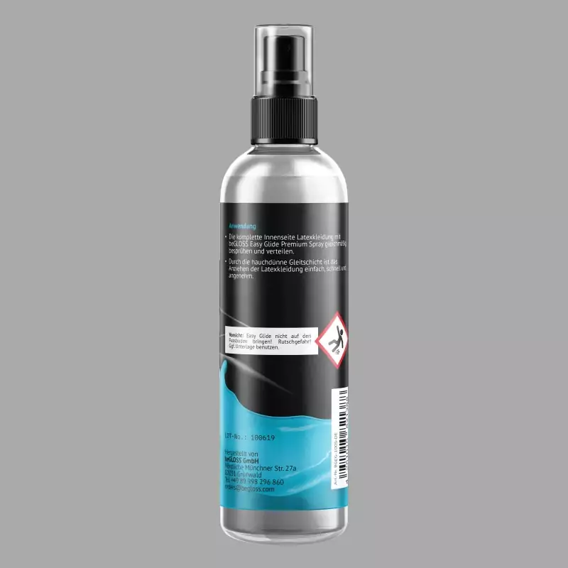beGLOSS® Easy Glide™ je prvotřídní obvazová pomůcka v praktickém sprejovém formátu. Sprej lze aplikovat obzvláště rychle a rovnoměrně na latexové oblečení. Díky své speciální viskozitě je velmi úsporný a ideální pro oděvy a masky z citlivého, tenkého latexu. Zajišťuje příjemně hladký pocit. Vyrobeno v Německu.
