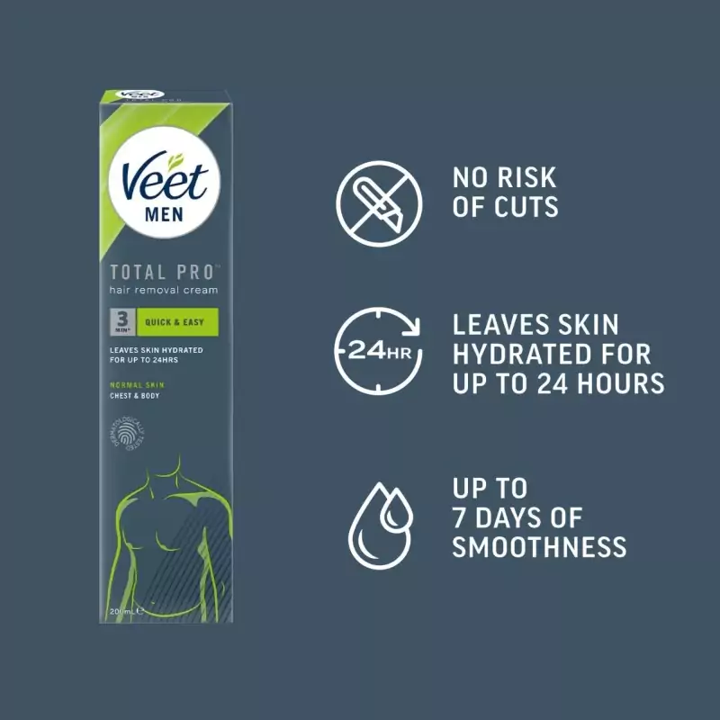 Krém na odstranění chloupků Veet Men Total Pro™ byl vyvinut speciálně pro potřeby mužské pokožky. Rychle a účinně odstraňuje nežádoucí ochlupení. Krém zajišťuje výrazně hladkou pokožku, hydratuje až po dobu 24 hodin a umožňuje odstranění chloupků na horní části těla a nohou bez rizika pořezání, jako tomu může být při holení.