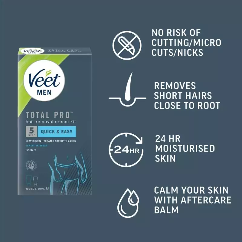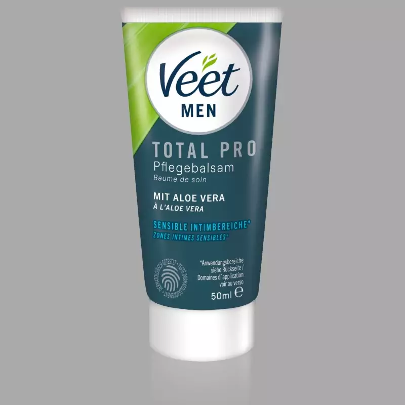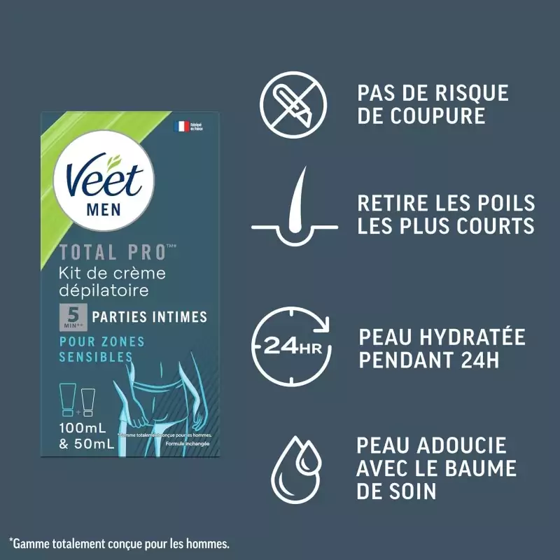 Sada pro odstraňování intimních chloupků Veet Men Total Pro™ byla speciálně vyvinuta pro použití v citlivých intimních oblastech. Kombinace depilačního krému pro intimní oblast a pečujícího balzámu s aloe vera umožňuje důkladné odstranění chloupků bez rizika pořezání, jako tomu může být při holení. Výsledkem je hladká a upravená pokožka během několika minut. Jako depilační krém pro intimní oblasti je sada přizpůsobena speciálním požadavkům citlivé pokožky a je ideální jako depilační krém pro muže.