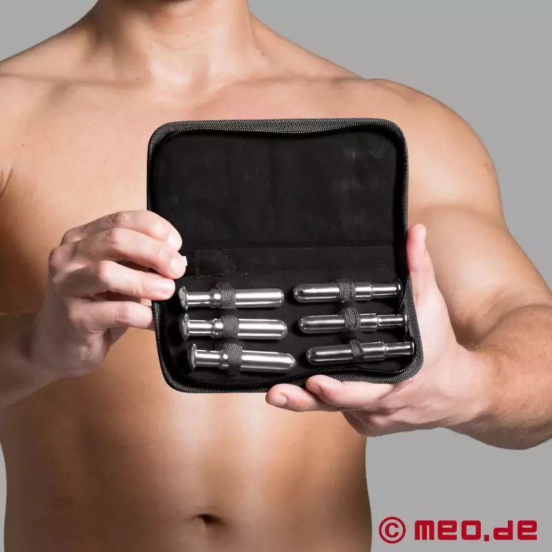 Rozhodněte se pro nekonečné potěšení s touto kompletní sadou dilatátorů. Sada dilatátorů od MEO® je vyrobena z vysoce kvalitní lékařské nerezové oceli a nabízí bezpečný a hygienický způsob účinného roztahování močové trubice pomocí penisových kolíků v 6 různých velikostech. Všechny dilatátory jsou ergonomicky tvarované a zaručují pohodlné používání. Naše penisové kolíky mají bezešvou zaoblenou špičku pro snadné zavádění a hřibovitou hlavičku, která zabraňuje jejich příliš hlubokému zasunutí. Naše penisové kolíky lze samozřejmě sterilizovat. Sada je dodávána v elegantním koženém pouzdře pro diskrétní a hygienické skladování.