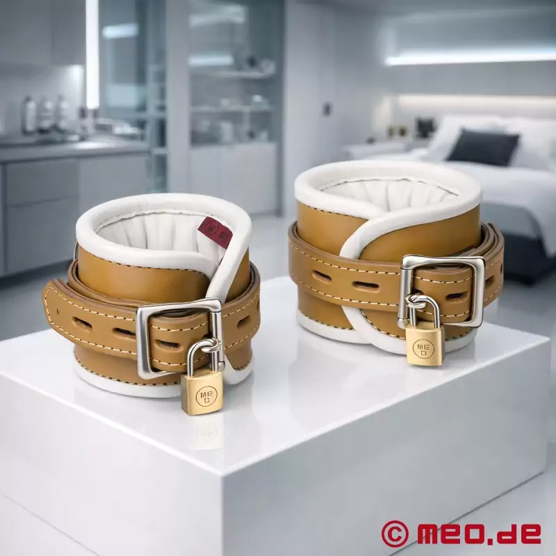 Zatímco psychiatrické instituce se z etických důvodů spoléhají na méně omezující metody, tato vysoce kvalitní pouta jsou vyhrazena výhradně pro nejnáročnější BDSM studia v Evropě. Jsou vyrobena z prvotřídní kůže v kombinaci plavé a bílé barvy a vyznačují se speciální povrchovou úpravou, která kůži dodává atraktivní povrch a příjemný omak.