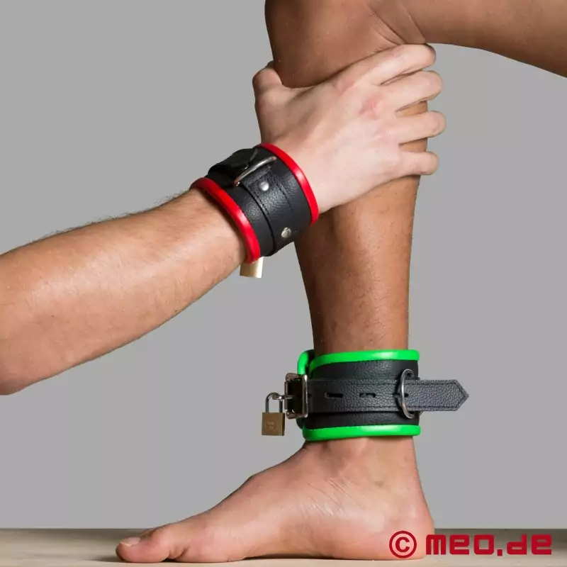 U těchto dvoubarevných pout na ruce z pravé kůže si můžete vybrat z různých barev, jako je černá, zelená, červená, modrá a bílá. Tyto barvy jsou obdobou Hanky Code, který je známý po celém světě. Tento barevný kód nenechává žádné otázky bez odpovědi a Sub může potenciálním partnerům předem sdělit, co má rád nebo jaký je jeho fetiš.
