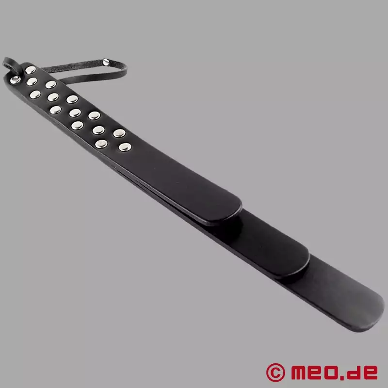 Tato klasická BDSM facka s názvem THE PAIN ze série HURTME® od MEO® se třemi robustními nýtovanými vrstvami zajišťuje obzvláště hlasité, intenzivní údery a dlouhotrvající účinek. Je vyrobena z vysoce kvalitní černé umělé kůže s kontrastními nýty z nerezové oceli a představuje nejen veganskou alternativu pravé kůže, ale také nepostradatelný BDSM doplněk pro udržitelnou výchovu a efektivní výprask.