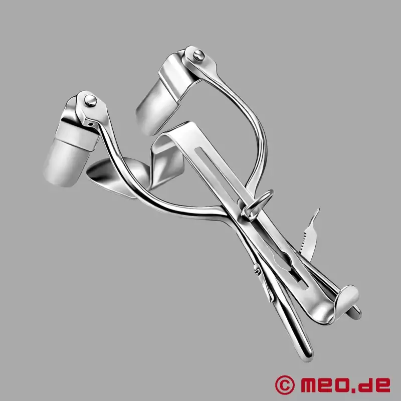 Spekulum AnusMagnus™ od MEO® umožňuje široce otevřené, přesně nastavitelné anální roztažení. Tři pohyblivé rozpěrné prvky - dva horizontální a jeden vertikální - zajišťují maximální otevření až 11 cm. Díky tomu je toto profesionální anální spekulum výjimečným nástrojem pro pokročilá BDSM sezení a hraní rolí.